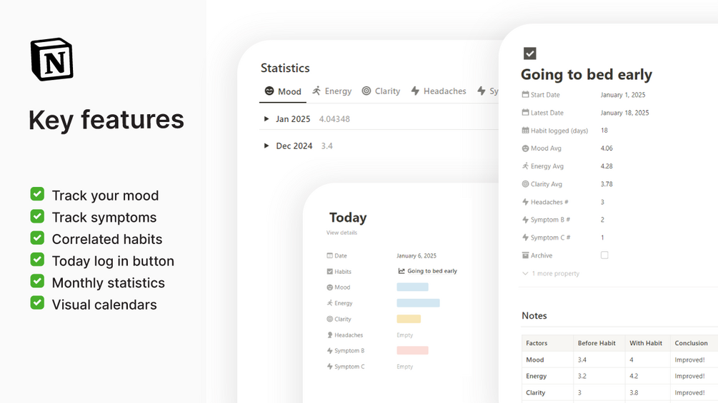 The Mood Tracker is the ideal Notion template for monitoring your mood and symptoms. See statistics for mood factors, symptoms as well as your related habits.